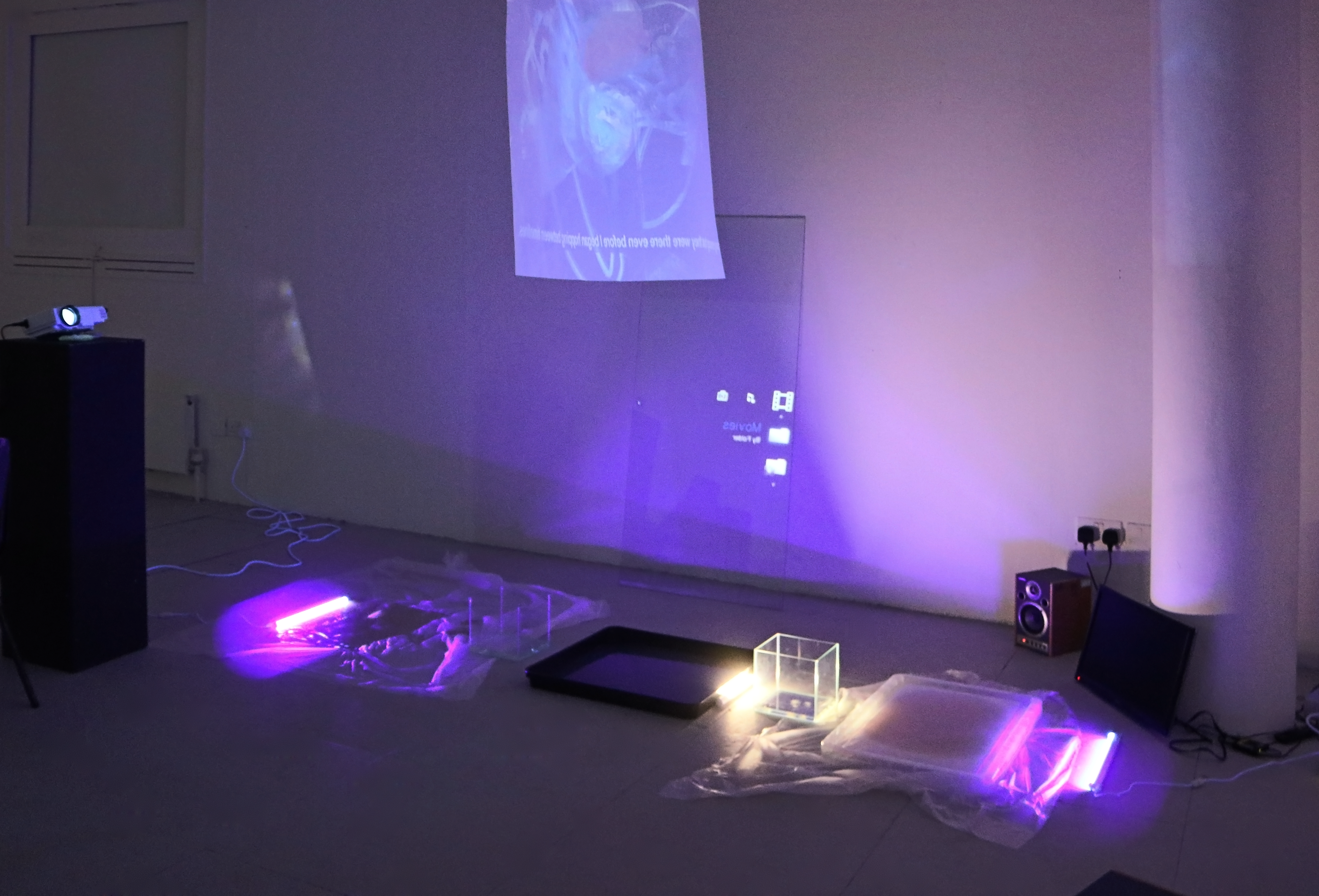 This moving image installation is a continuation of in vitro [ _ ] |{ _____ } (2019), it experiments with and furthers the form and themes explored in the earlier exhibition.