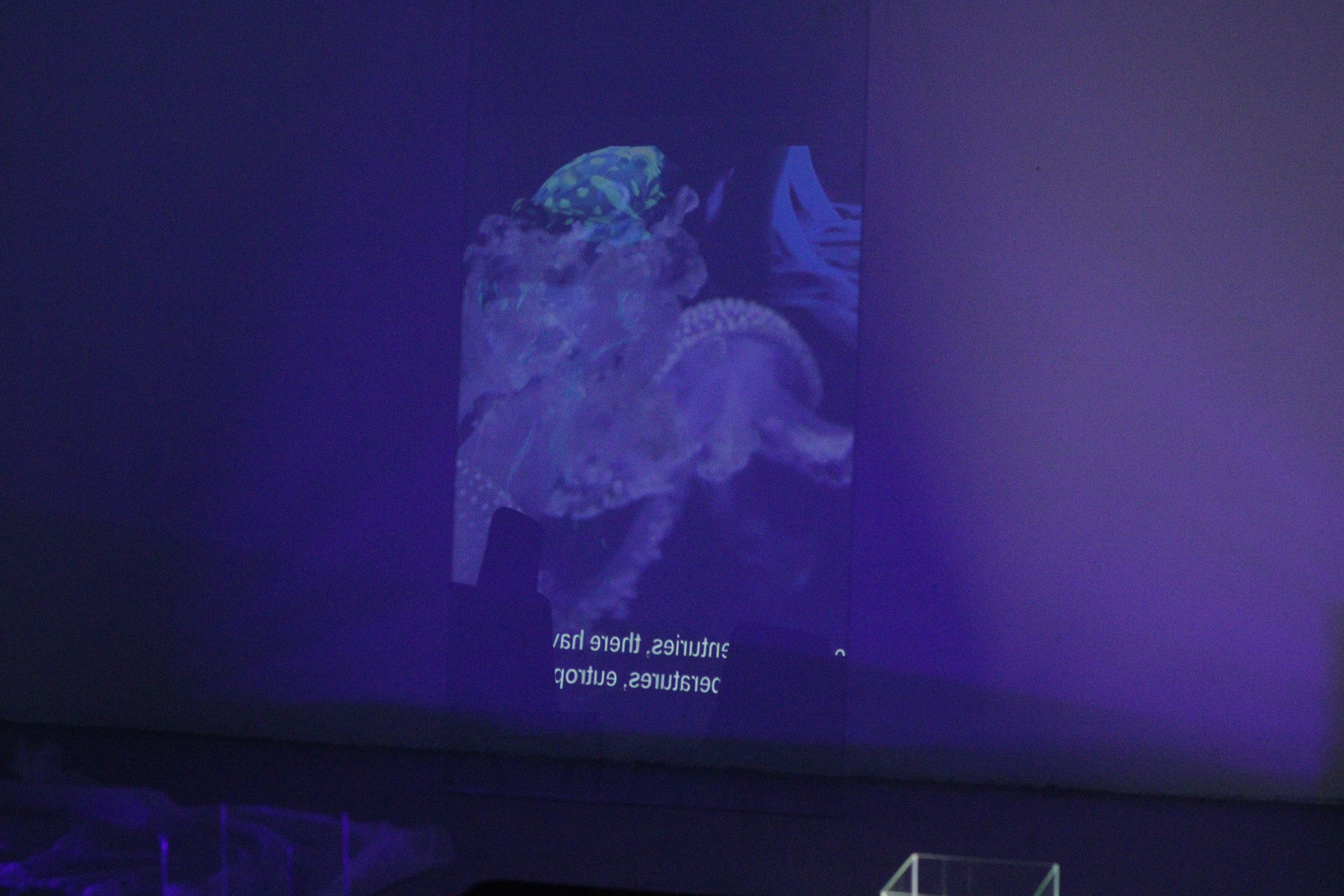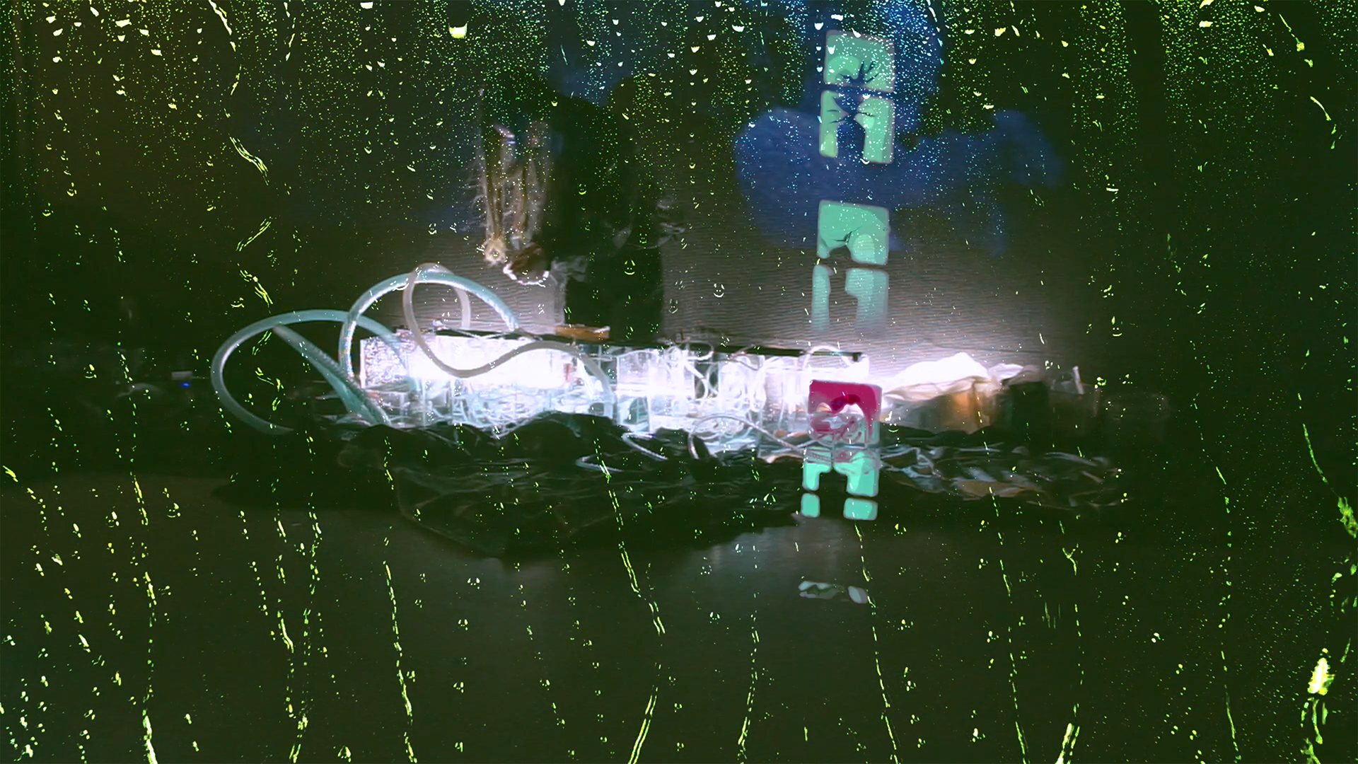 The narrative film and installation explore the beauty and tension of interspecies networks and negotiation of the performative human/nonhuman body, integrating performance documentation, fictional narratives, and found footage from documentaries on aquaculture and oceanic life. It considers the notion of the 'umwelt' and milieu as an assemblage instead of a closed system. The audience is invited to closely inspect and touch the amorphous materials at their different fundamental states of matter, forming sensorial relations with the materials beyond the scope of seeing and being seen.