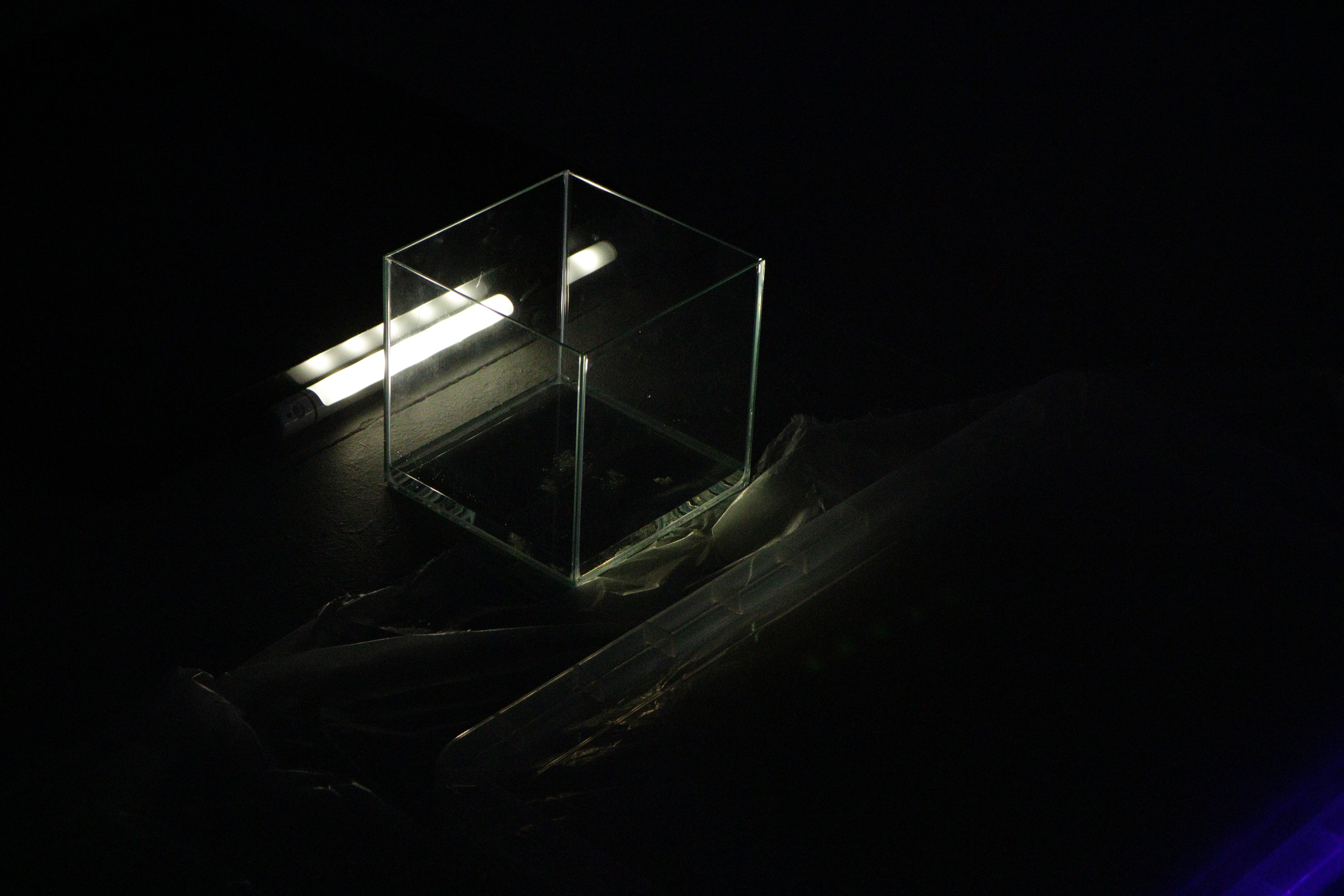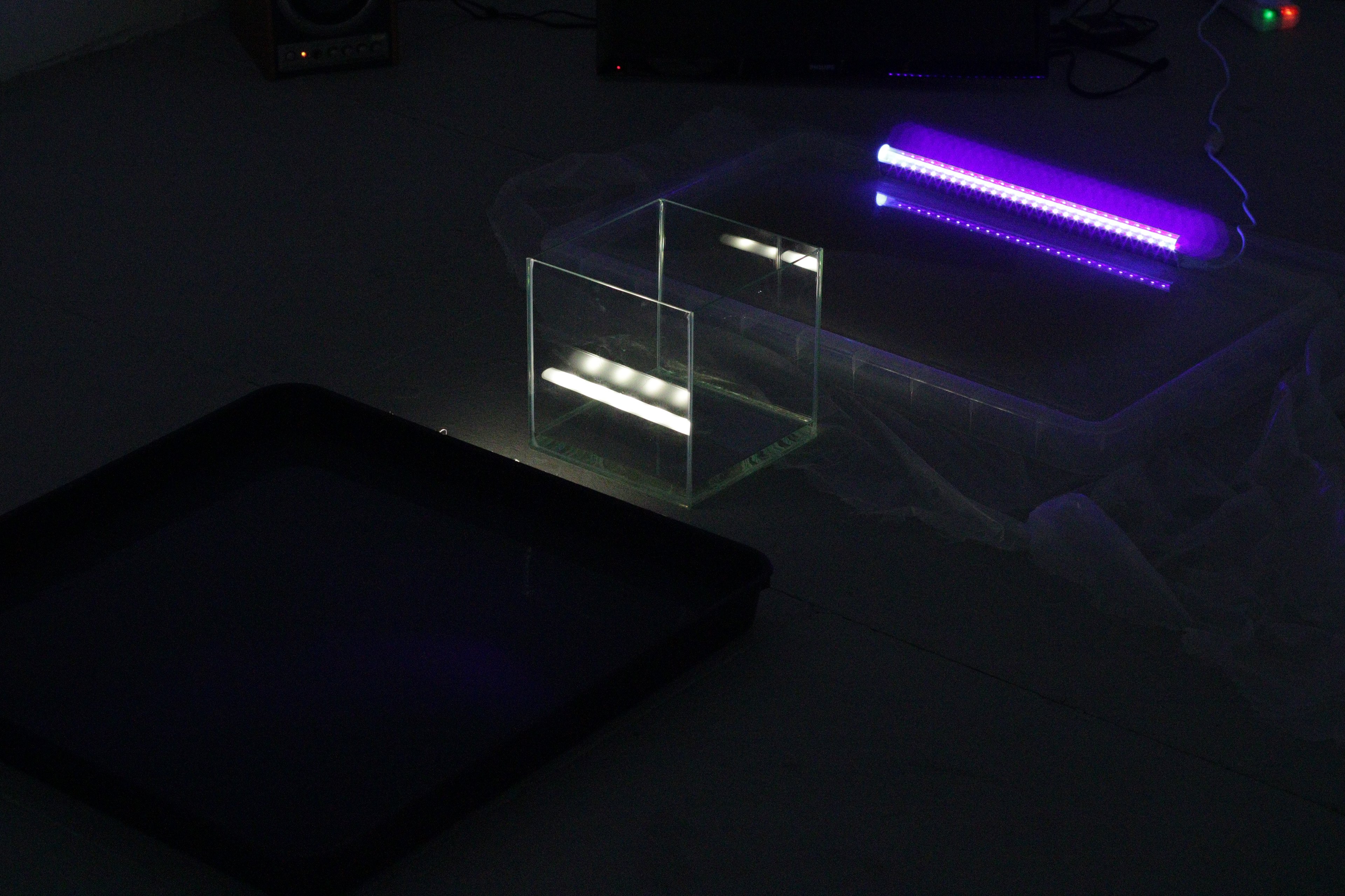 plastic trays, paper, UV light, chains, glass panes, monitor.