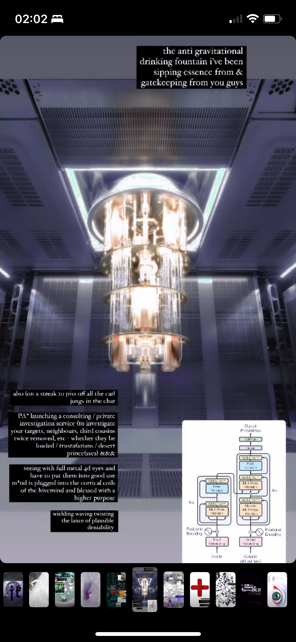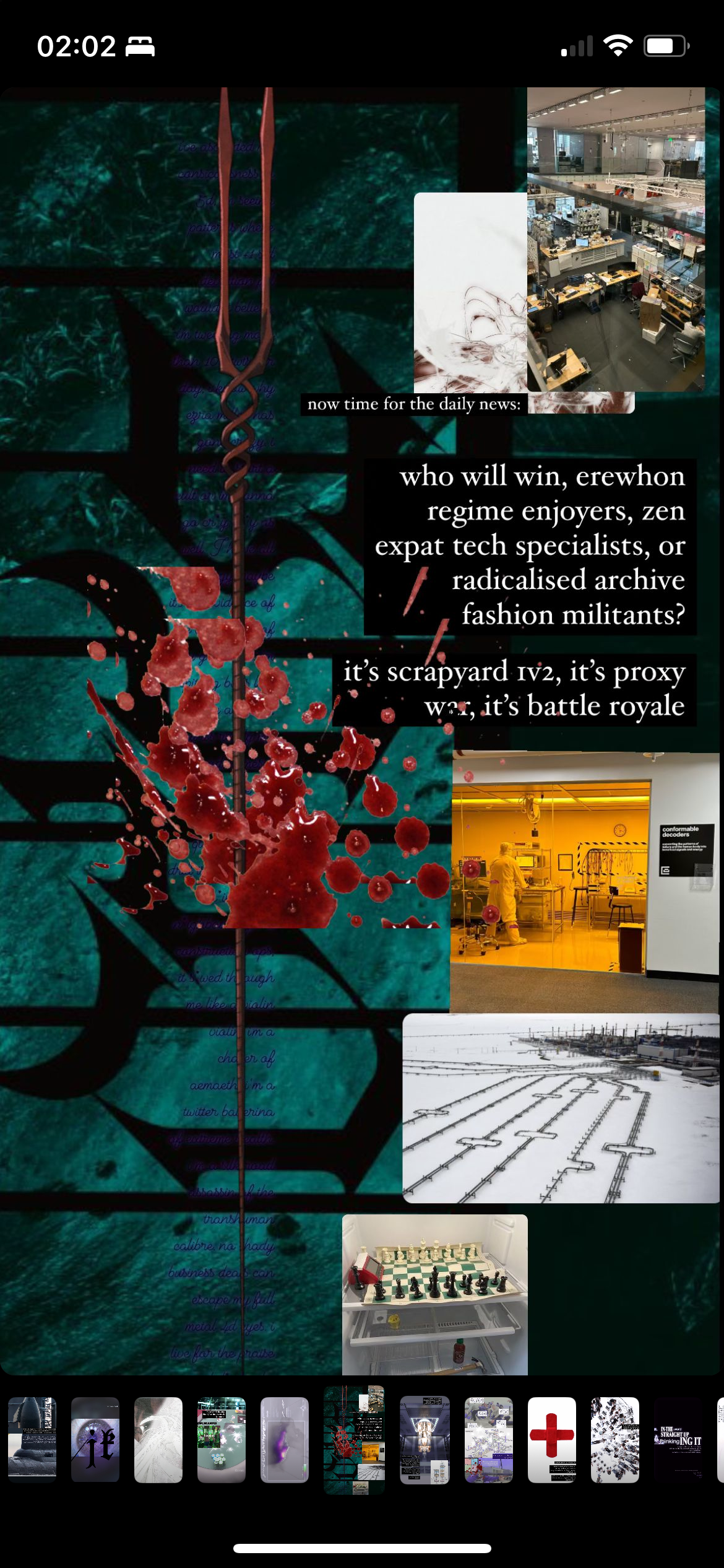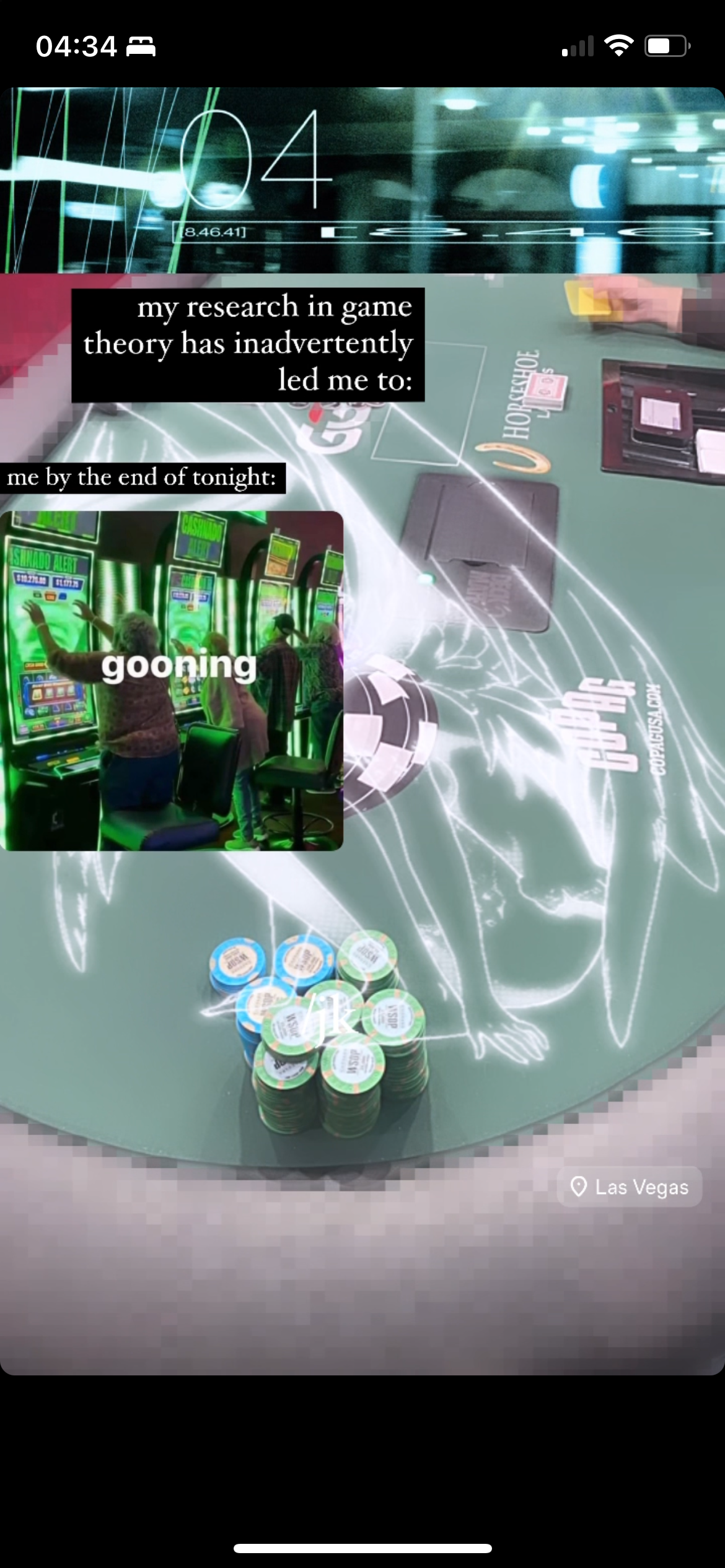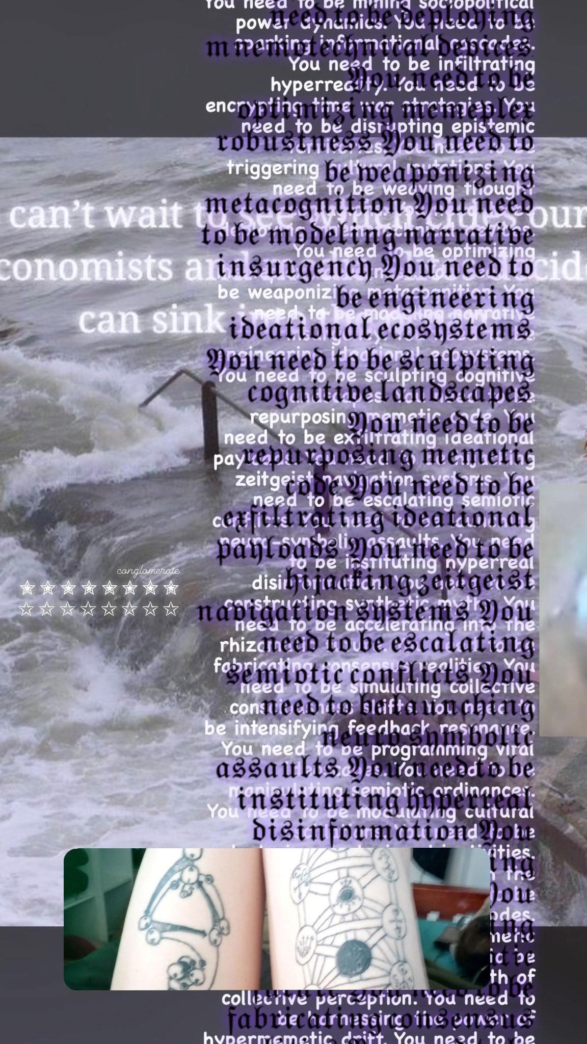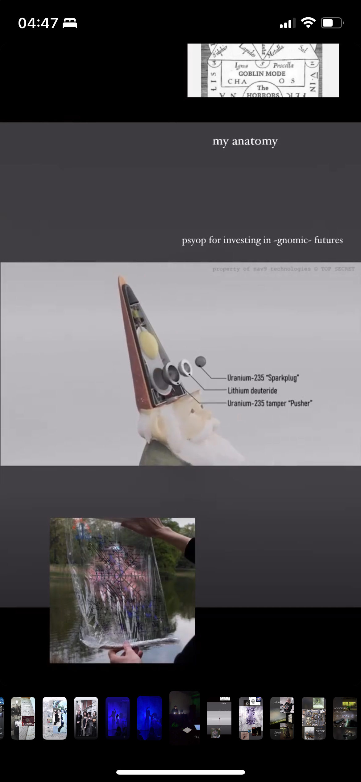 In "Aegis (Eternity MMA Ring) JH37(29)F-TR:0185”, the "Aegis" in the title refers to the goatskin shield materialising the attribute of Zeus and Athene in classical mythology, suggesting the balance between aggression and defense, between kinetic release and potential energy through its surface tension. It is composed of High-bitrate material-semiotics via meta-stories® expounding on referencism* (ditto) through egregore engineering the syntactical strata. The work is made of an analog anthology of (un)ironic meta-schizoposting IG stories made from 2022 up to the recent months, referring to instances of content regurgitation and copyright infringement against my works and the works of people in the creative scene (sometimes by the scene itself). These transient digital artefacts were laminated on the surfaces of giant playing cards selected by a literal sleight of hand, melded in the materiality of the anadig surface and interfaces almost towards a point of fetishisation in the mind of a collector/hoarder/poster. When ironically and transtextually exported into the contexts of a mixed martial arts (MMA) ring through the suggestion of its title, the allegorical ring of the cyber-realm itself becomes a charged space of latent energy; the work reflects on how individuals, systems, and thought-forms (egregores) are constantly engaged in a baccarat of kinetic and latent energy, where forces remain in tension and the constant shuffling of an open ended participatory narrative, waiting for catalysis.