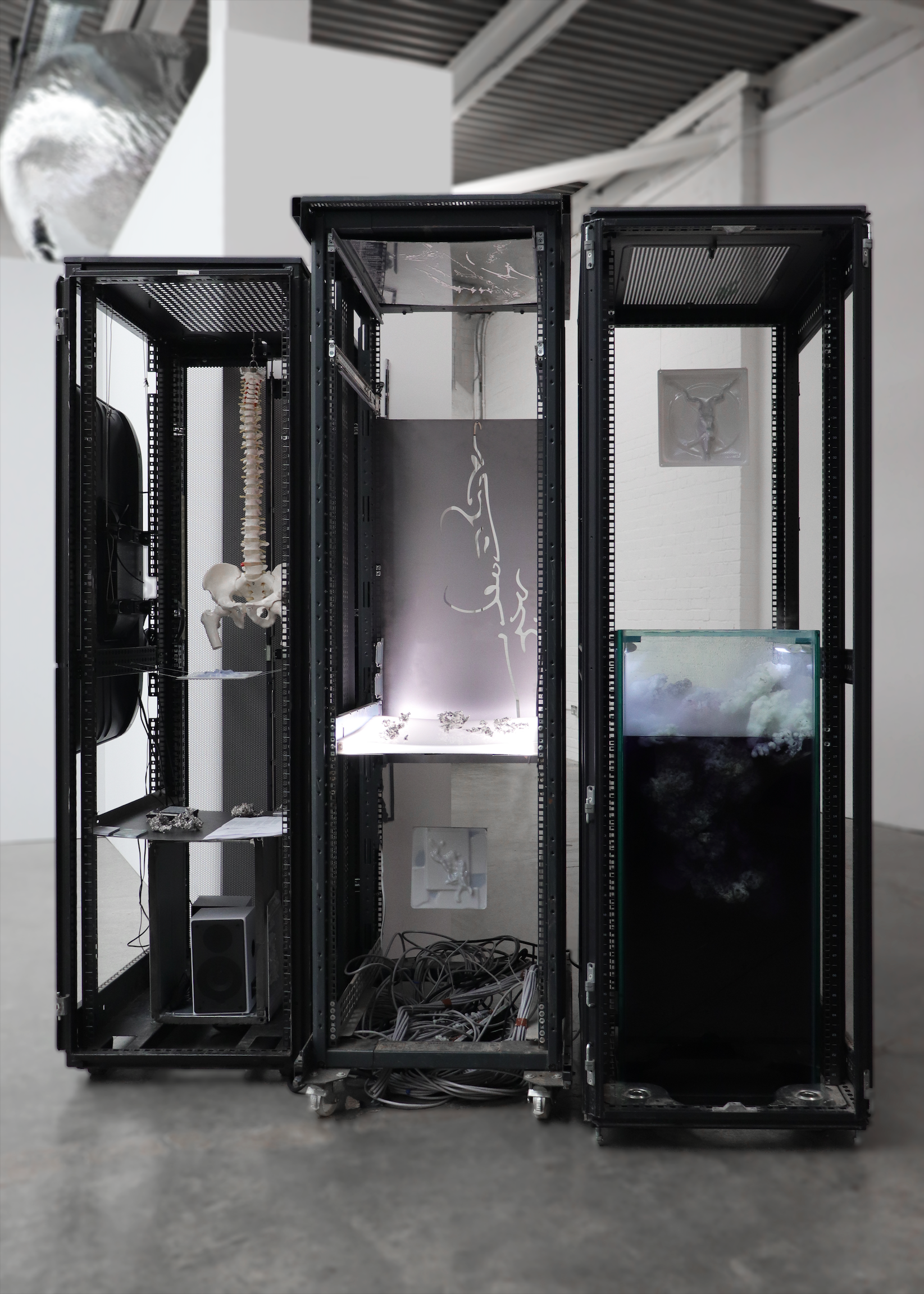 Ballistic gelatine, synthetic DNA, computer server racks, silicone, polyurethane, thermoplastic, LED, liquid crystal display, tin, zinc, antimony, mild steel, stainless steel, microcrystalline wax, glass wax, water, fog, engraved acrylic mirror, spinal anatomic model, SSD hard drive, e-waste